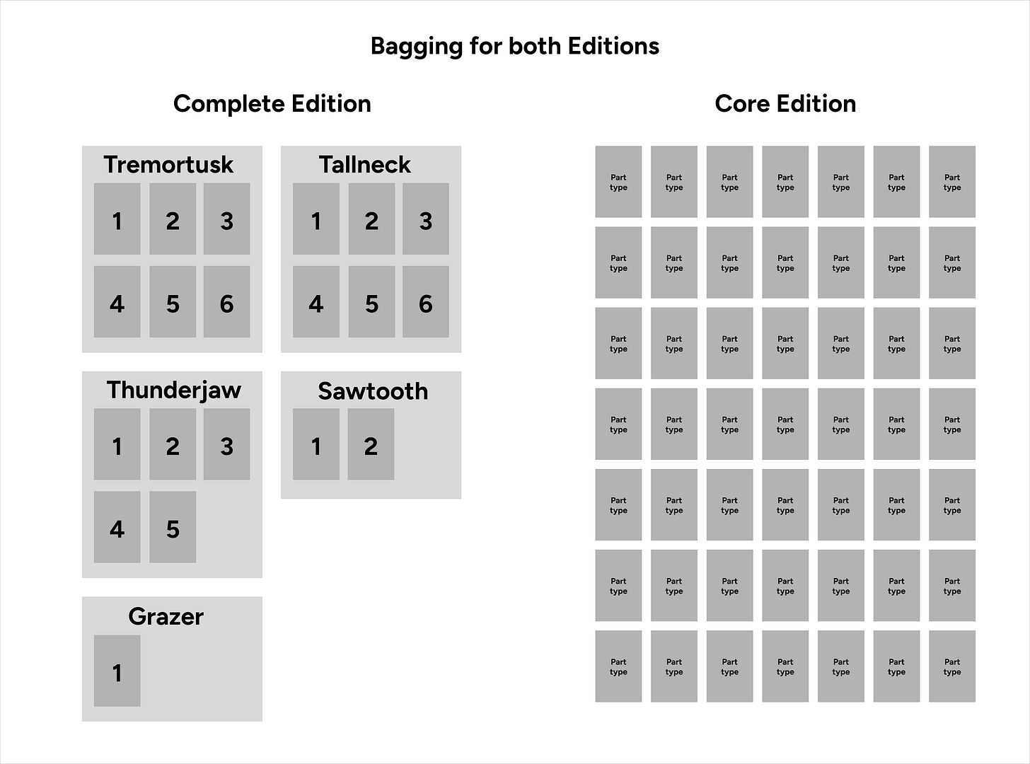 Ultimately, we think that the best approach is to have the parts sorted for you in bags, so that even once you’ve built a beast, the rest of your remaining parts are still in a sorted state. What this means during your build is that you may need to identify a few more bags than those building with the Complete set, but we’ll try to bundle them up and create a balance of not too many part types per bag but not too many bags either.